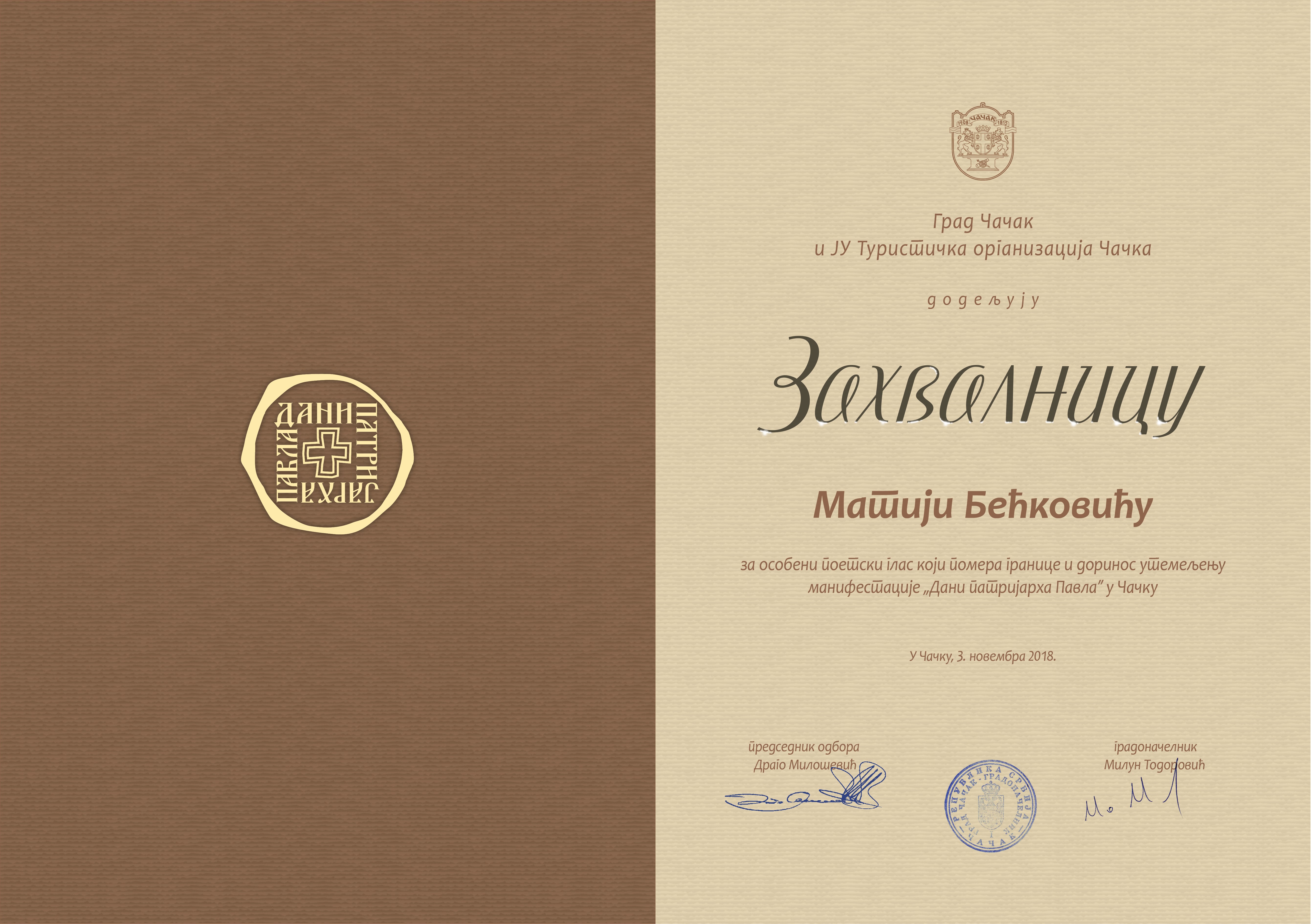- Захвалница Матији Бећковићу за допринос утемељењу манифестације