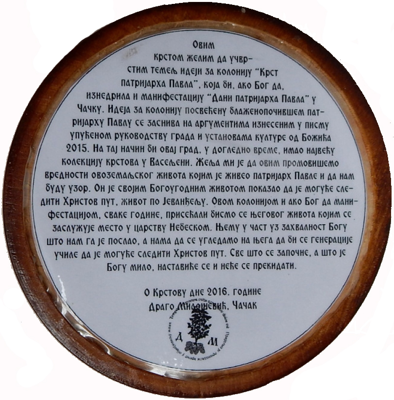 и сам аутор првог крста, утемељивача идеје, у чијем је постаменту његов аутор написао мотив оснивања